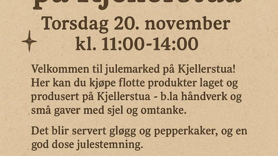 Velkommen til julemarked på Kjellerstua Torsdag 20. november inviterer Kjellerstua til julemarked på Follebutunet. Her kan du kjøpe håndlagde produkter, nyte gløgg og pepperkaker, og komme i ... Publisert 10.11.2025 kl. 07:36