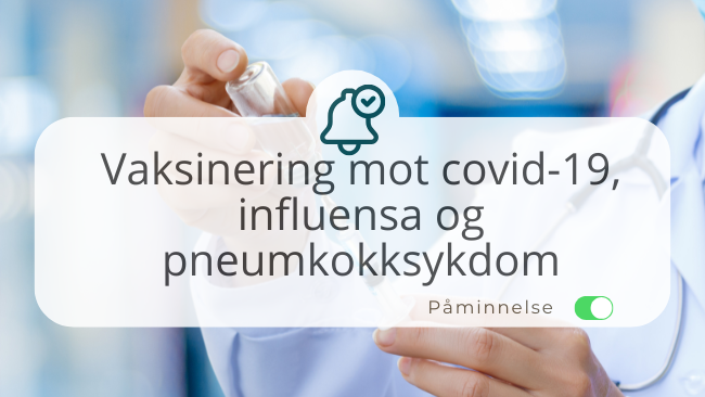 Vaksinering mot covid-19, influensa og pneumkokksykdom Det anbefales at alle over 65 år, samt personer i risikogrupper, tar vaksine mot både influensa, koronavirus og lungebetennelse (pneumokokkvaksine). D... Publisert 29.09.2025 kl. 15:13