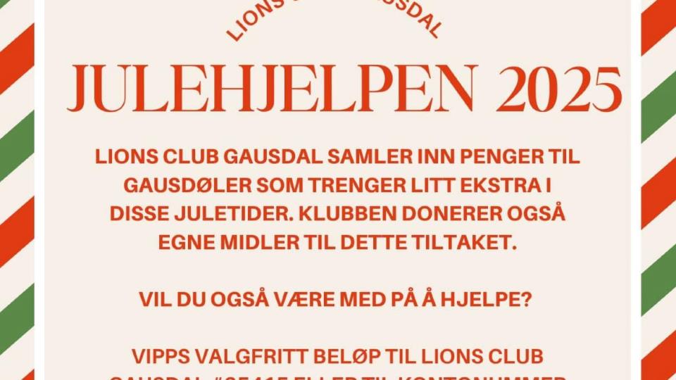 Julehjelpen Lions club Gausdal fortsetter tradisjonen med å samle inn penger til gausdøler som trenger litt ekstra til jul. De utfordrer både privatpersoner og be... Publisert 14.11.2025 kl. 12:01