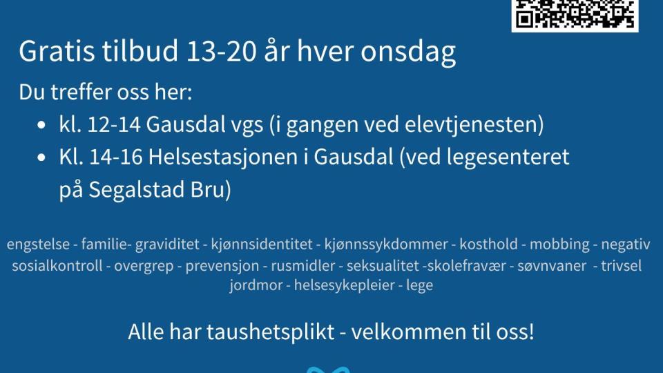 Helsestasjon for ungdom i Gausdal Helsestasjon for ungdom er et gratis og trygt tilbud for deg mellom 13 og 20 år. Nytt i år er at åpningstiden er delt mellom skole og helsestasjon. Publisert 22.01.2026 kl. 14:31