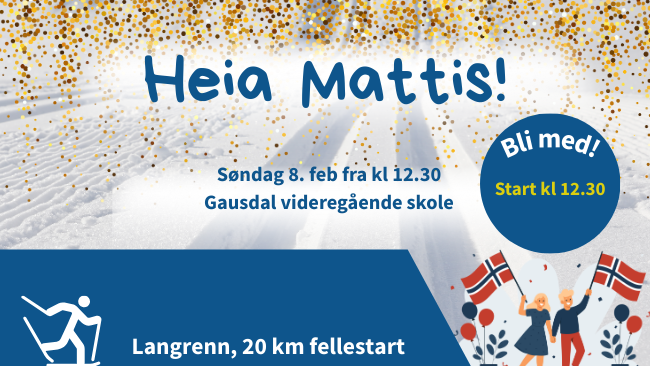 Bli med og hei fram Mattis under OL søndag 8. februar Søndag 8. februar inviterer Gausdal skiklubb, Gausdal videregående skole og Gausdal kommune til felles OL-visning på Gausdal Arene / Gausdal videregåe... Publisert 05.02.2026 kl. 15:48
