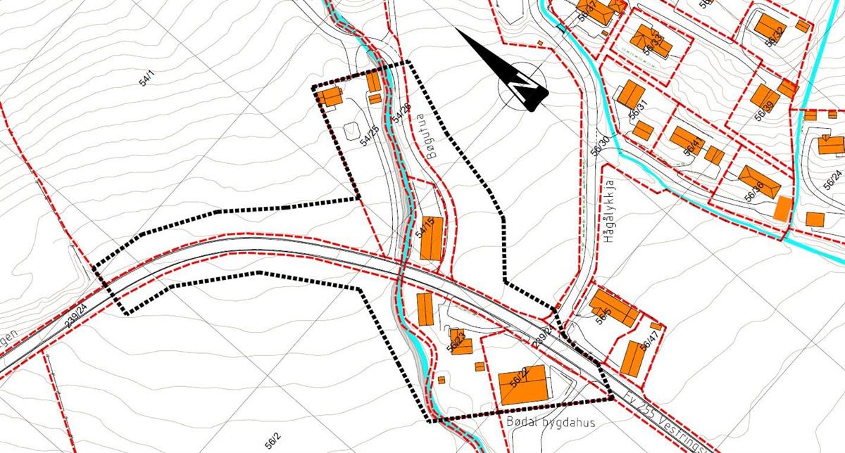 Varslet planområde dekker en kort strekning på fylkesveg 255, der vegen krysser elva Vigga like ved Bødal bygdahus.